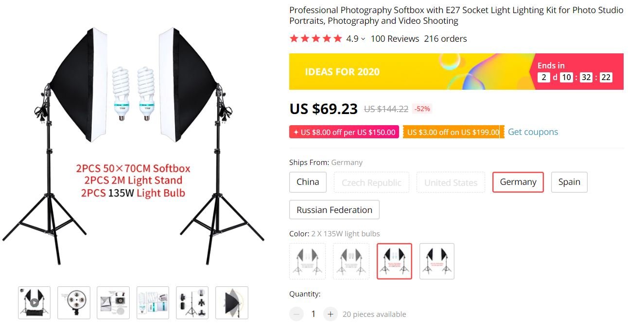 AliExpressistä löytyi hurja valikoima erilaisia valaisinratkaisuja tarjoavia myyjiä. Silmiin pisti hyvät palautteet saanut SH Official Store ja heidän myymä $69.23 dollarin hintainen *kahden 50x70cm softboxin setti 135W polttimoilla ja säädettävillä jalustoilla.